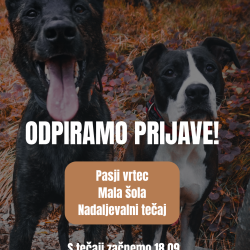 Začenjamo z vpisi v jesenske tečaje pasje šole! V tečaj Pasji vrtec sprejemamo pasje mladiče od prihoda v vaš dom do 6 meseca starosti. Z inštruktorico se boste dobivali Preberite več o Vpisi v tečaji – JESEN 2025[…]